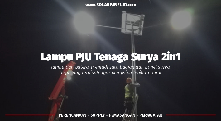 PJU Tenaga Surya 2in1 (two in one) adalah lampu penerangan jalan yang menggunakan listrik dari sinar matahari sebagai sumber listrik utama. Paket lampu PJUTS (Penerangan Jalan Umum Tenaga Surya) sangat disarakan untuk penggunaan pada daerah yang belum terjangkau oleh listrik PLN dan daerah yang sering mengalami pemadaman listrik secara bergilir salah satunya pada daerah terpencil. PJU Tenaga Surya 2in1 alternatif yang murah dan hemat untuk digunakan sebagai sumber listrik PJU, karena menggunakan sumber energi alami dari alam yang tak terbatas yaitu energi matahari.