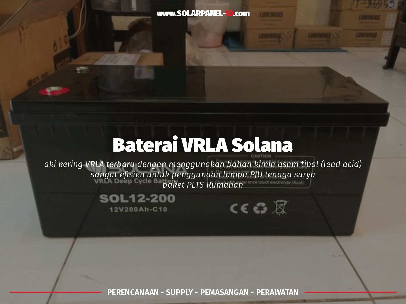 Baterai VRLA Solana merupakan aki kering VRLA terbaru dengan menggunakan bahan kimia asam tibal (lead acid) sebagai bahan kandungan dalam baterai. VRLA sendiri merupakan singkatan dari Valve Regulated Lead Acid, teknologi yang dikembangkan buat aki kering atau Maintenance Free (MF). Agar tetap bebas perawatan namun bisa dipakai dalam waktu lama, ada beberapa teknologi yang disematkan pada aki tersebut. Tujuannya agar cairan aki atau elektrolit yang terisi tidak mudah menguap meski terjadi getaran atau goncangan. Pada aki kering, terdapat valve atau katup pengaman yang mengatur agar penguapan cairan yang terjadi dapat kembali lagi ke dalam sel aki.